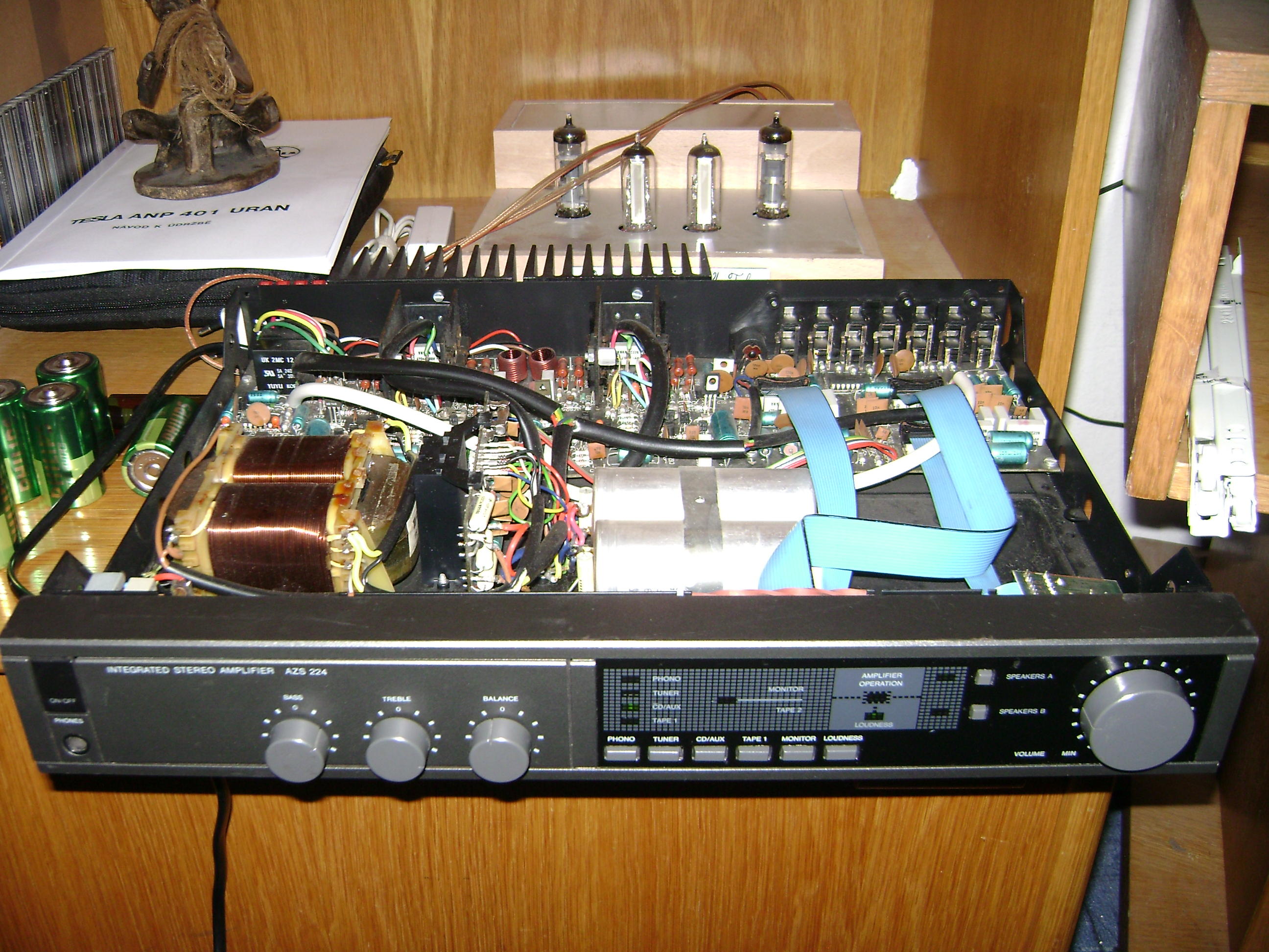All: Dnešní úlovek - viděl jsem ho poprvé a musel jsem ho hned mít - zesilovač Tesla AZS224. Teď hledím na něj a do něj - rychlé foto http://nd03.jxs.cz/747/575/f89f8cf086_88895860_o2.jpg a je to opravdu úplně jiná konstrukce než AZS225-ETA2477 - by't skříňka je téměř stejná. Hlavní rozdíly céčkové trafo proti toroidu, výkon 2x40 sin proti 2x15 sin, přepínání 2 párů repro atd. Každopádně podrobnějsí článek a fotky a porovnání bude na blogu (brzo...snad)