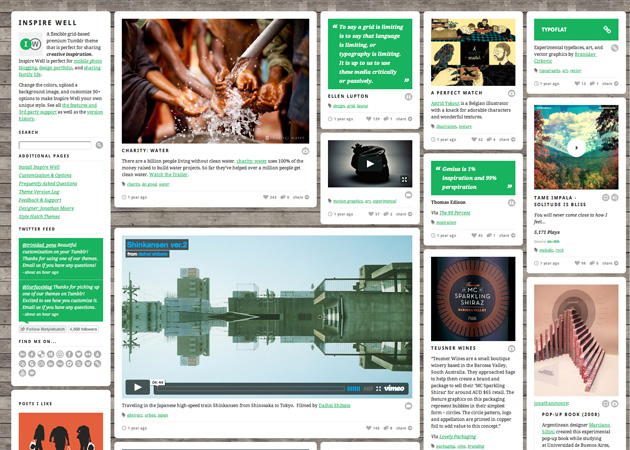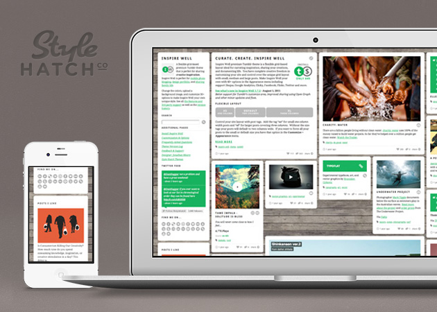 Inspire Well premium Tumblr theme by Style Hatch is a flexible grid-based layout ideal for curating inspiration, sharing your creations, and documenting life. You have complete creative freedom in customizing your site and control over the unique grid layout with small, medium and large posts.