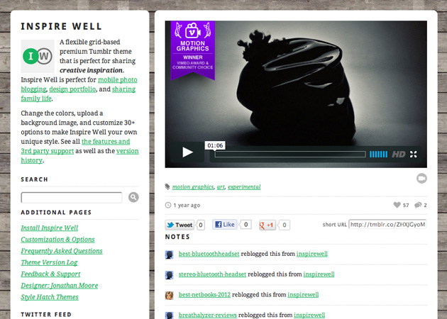 Latest Version - Inspire Well 1.9.7 | May 30, 2013 — Adding the new Tumblr audio player. Fixing an issue with the new HTML5 audio player and infinite scrolling. Adding support for the new Twitter timeline widget. Improving the appearance of Soundcloud and Spotify audio posts. Now you can add your Instagram feed to your sidebar! Check out the setup details at stylehatch.co/instagram