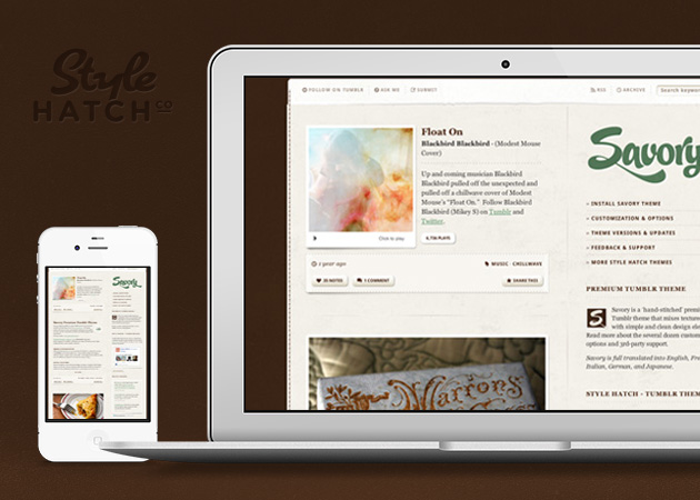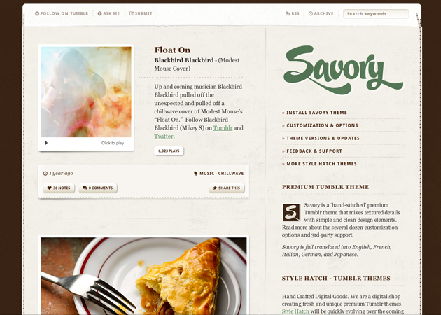 Savory is quite possibly the only Tumblr theme ‘hand-stitched’ and full of textured goodness from Style Hatch. The theme comes with several dozen customization options to personalize the look and feel. Best of all you’ll have incredible support from Style Hatch.