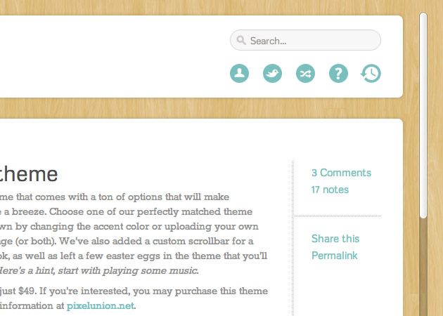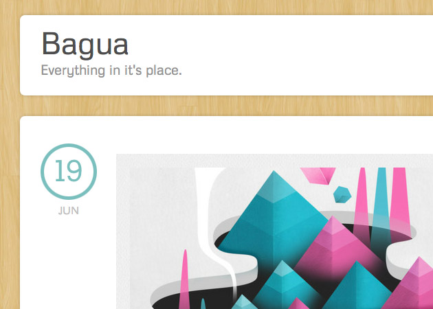 Bagua is a theme for bloggers that provides a very customizable and functional design for their Tumblr. A blonde wood or geometric background is accented with default seafoam, salmon, or blue icons and text highlights. A custom scroll bar makes viewing posts simple and graphic. And if you want more customization, Bagua allows you to use custom background imagery or color, as well as any custom accent color, or any combination of colors and defaults.