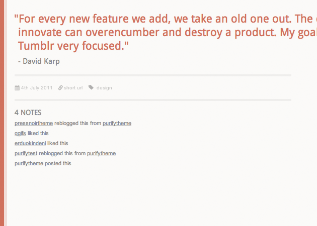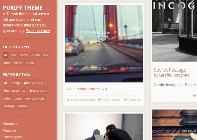 Purify’s main features are a fantastic grid layout that responds to the browser size. You can also filter your posts by type and by tag, giving your site’s users an awesome experience.