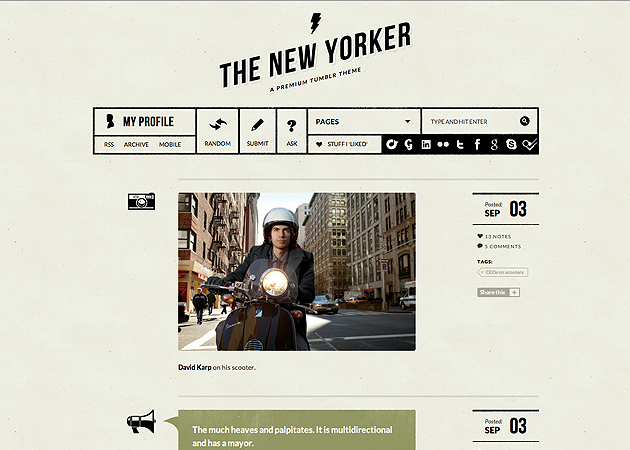The New Yorker is a throwback Tumblr theme, steeped in 50’s iconography and oozing the cool of the Mean Streets themselves. Customize the icons, choose your color version and accents, then link it up with any of your numerous social network sites to create a bold, metropolitan blogscape!