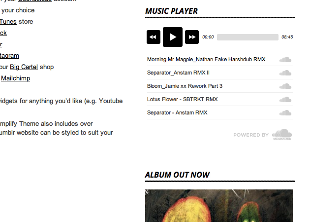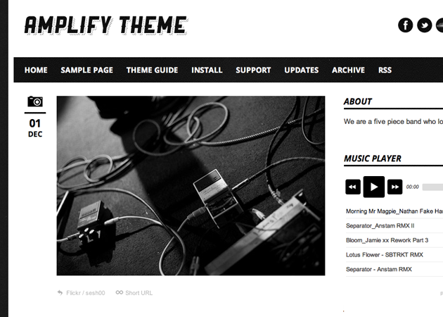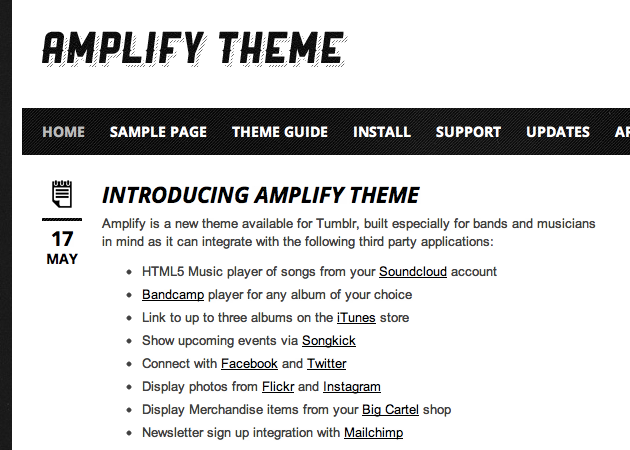 Amplify is a new theme available for Tumblr, built especially for bands and musicians in mind as it can integrate with the following third party applications: