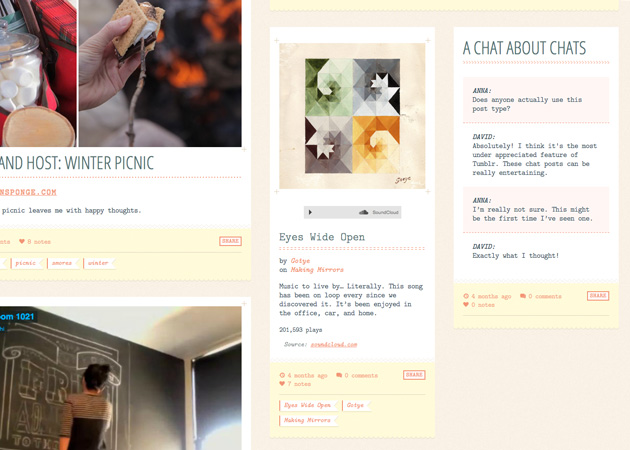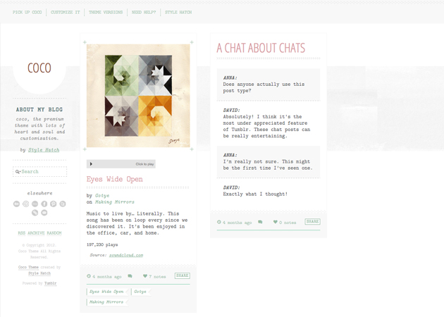Latest Version - Coco 1.3.5 | July 17, 2013 — Added support for the read more button to all post types. Added the new Tumblr audio player. Adding support for the new Twitter timeline widget. Improving the appearance of Soundcloud and Spotify audio posts. Added the ability to load your recent shots on Instagram. Fixed various issues and bugs.