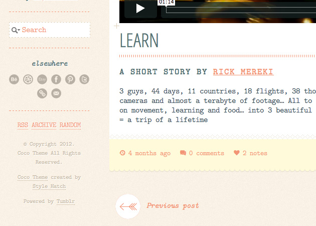 Coco has built in support for group blogs, sharing on Facebook, Twitter, Pinterest, and Google Plus, comments powered by Disqus, Flickr feed, and posts you like. Also in the appearances options you’ll find nearly 30 social profile icon links.