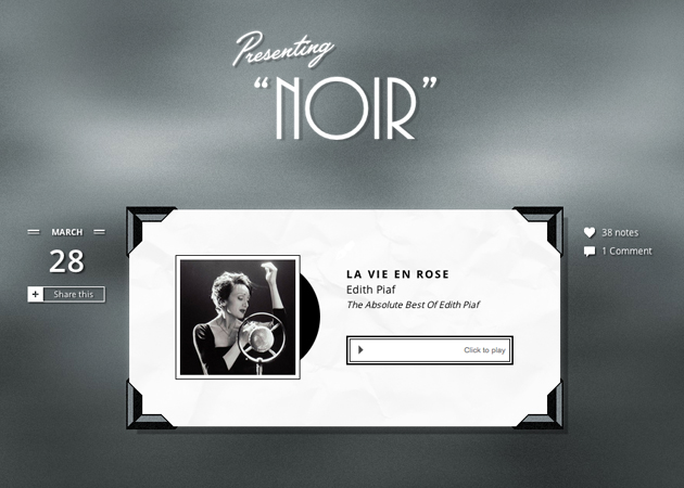 Noir comes decked out with a load of selectable flourishes, including a film-inspired “Presenting” above your blog’s title in the header, and a classy “From the Desk Of” in your text and link posts.