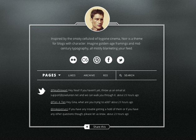 Inspired by the smoky celluloid of bygone cinema, Noir is a theme for blogs with character. Detail is Noir’s racket: golden-age framings and mid-century typography, all mistily blanketing your feed.