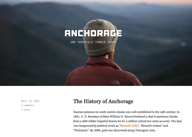 Anchorage's most prominent feature is its togglable oversized header, which features a parallax effect as the page is scrolled. That is, your header image moves at a slower pace than the frame around it, giving an eye-catching illusion of depth.