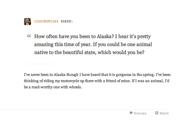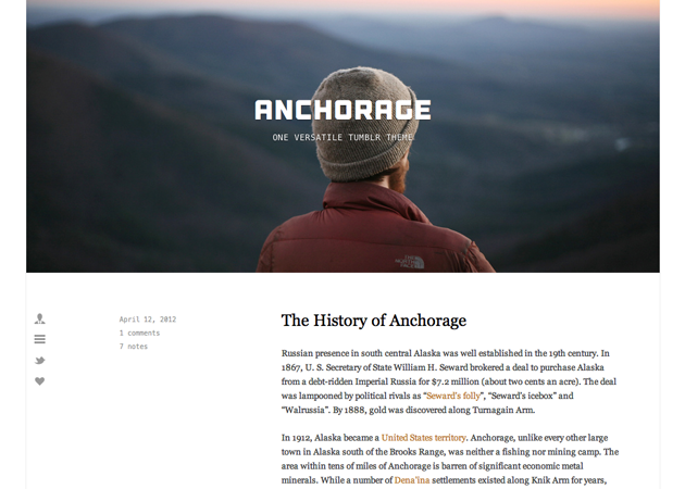 Like everything else we make, Anchorage is plugged into everything, including: Twitter, Facebook, Vimeo, Flickr, LastFM, Dribbble, Skype, Google+, GitHub, YouTube, LinkedIn, Svpply, Rdio, Gowalla, Foursquare, Instagram, and Pinterest. Linked icons for these are located in the sidebar.