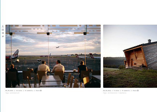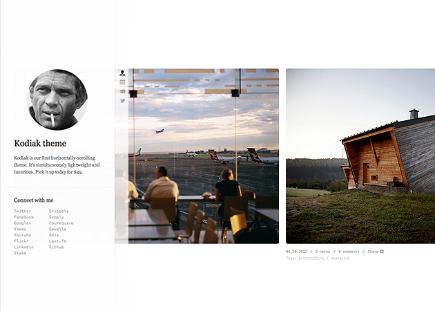 Kodiak is as close to being a magazine as themes can get. It's our first horizontally-scrolling theme, loaded with features like a tags tab, "smart" infinite scroll, and a brand new custom photoset mechanic. The second and most visually unique of our 3-theme Alaskan suite, Kodiak is simultaneously lightweight and luxurious.
