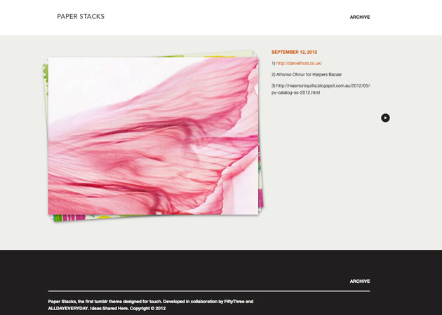 Paper Stacks, the first Tumblr theme designed for touch. Developed in collaboration by FiftyThree and ALLDAYEVERYDAY. Paper Stacks is a beautiful new way to showcase your ideas and inspiration discovered across the web.