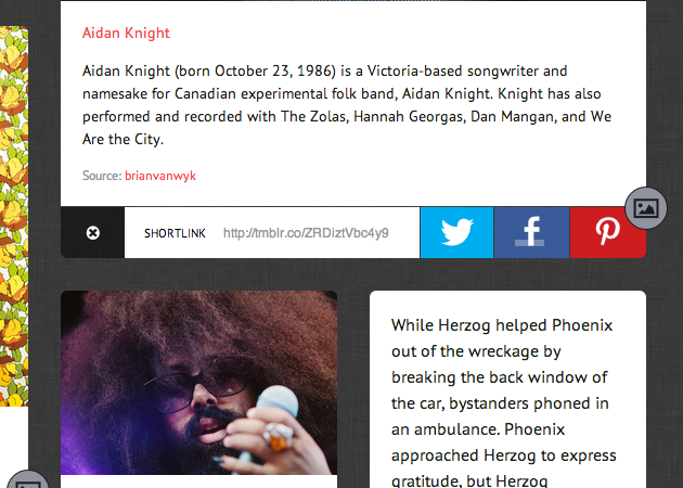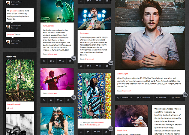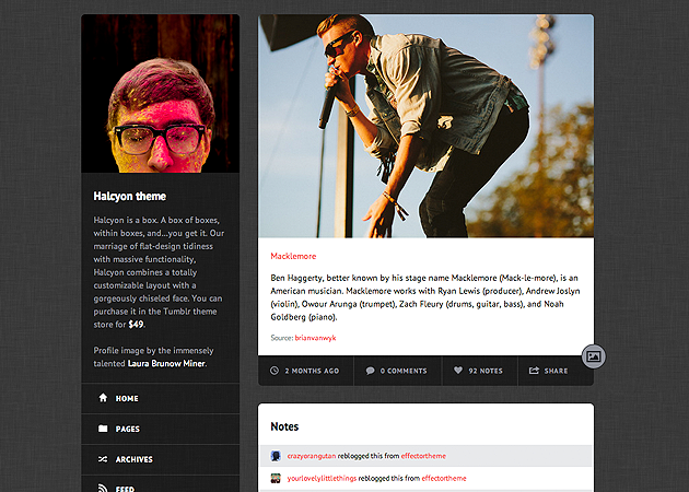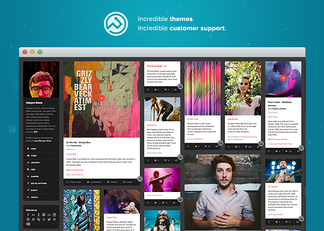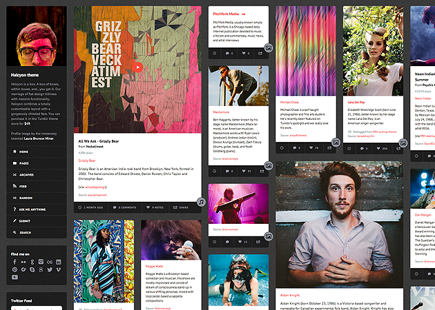 Like our other grid themes, Halcyon's posts can be tagged either "medium" or "large" to expand their size beyond the default small width. Content on permalink pages will display at medium width unless tagged otherwise though only video, photo, and photoset posts can be tagged "large."