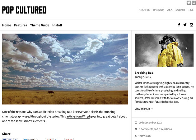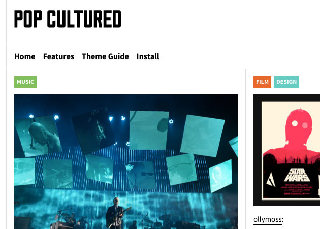 Pop Cultured is a Tumblr theme with a slick grid design that caters for both imagery and text articles. It is highly customizable and comes with heaps of special features including: