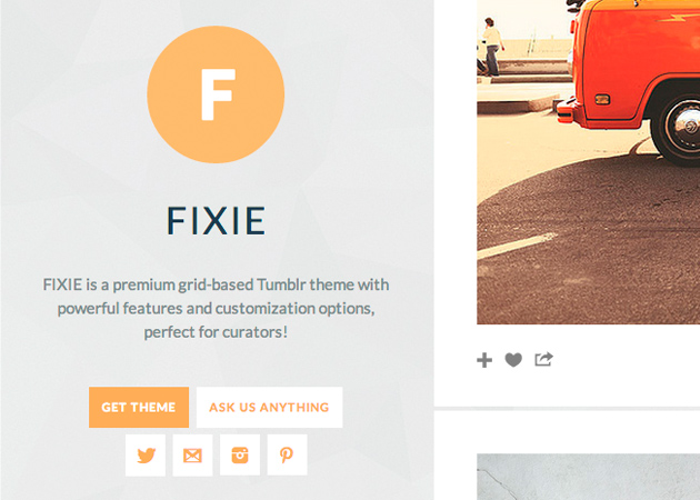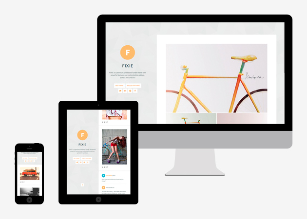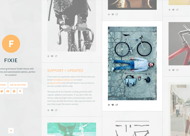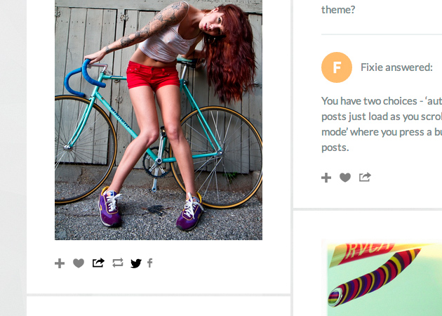 FIXIE also features a neat social sharing widget in the footer of each post - allow your visitors to quickly and easily like, re-blog, or share your posts on Twitter and Facebook.