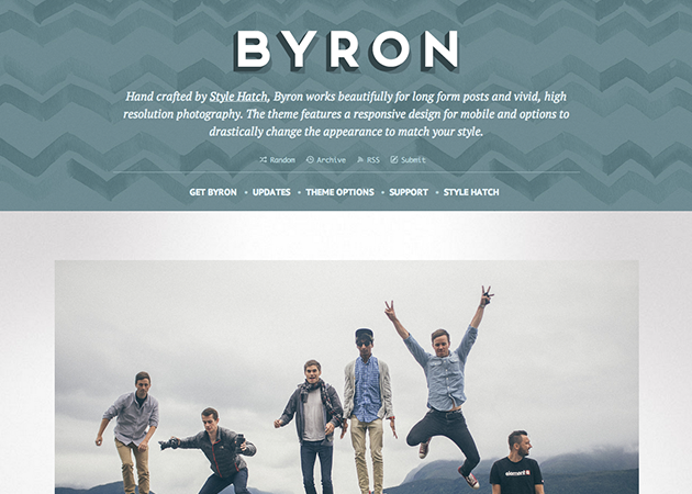 Latest Version - Byron 1.0.1 | May 1, 2013 — Adding the new Tumblr like and reblog buttons to the posts. The first version of Byron has been submitted to Tumblr. For an overview of the theme read the introduction post. If you have suggestions for future updates or need help email us at byron@stylehatch.co