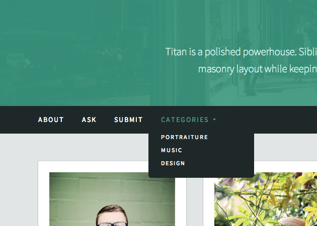Tag Collections / Drop-down menuLike our portfolio themes Kodiak and Aperture, Titan features a tag-organized collection menu. Simply enter the tags with which you'd like to group posts into the "Tag Collections" field in the customization options.