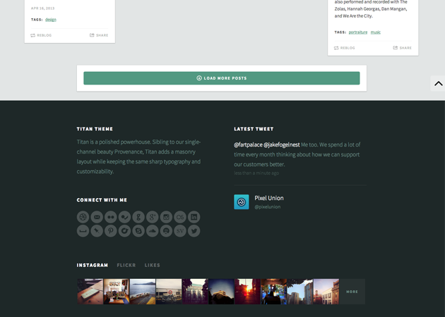 Instagram FeedTitan's footer features an (up to) 10-picture Instagram feed, easily setup in the customization options. Just head here to retrieve your access token, and plug it into the corresponding field in the customization options. Done!