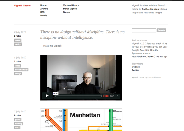 Vignelli was designed to sit back and let your content sing. The latest on version history and support can be found at vignelli.tumblr.com