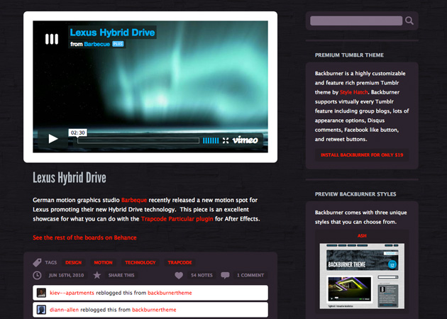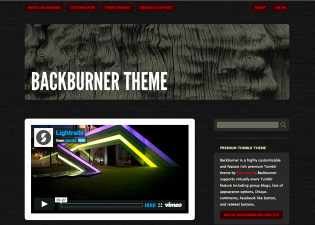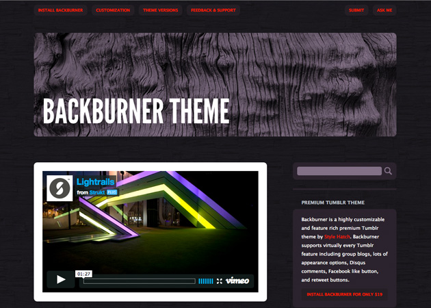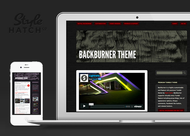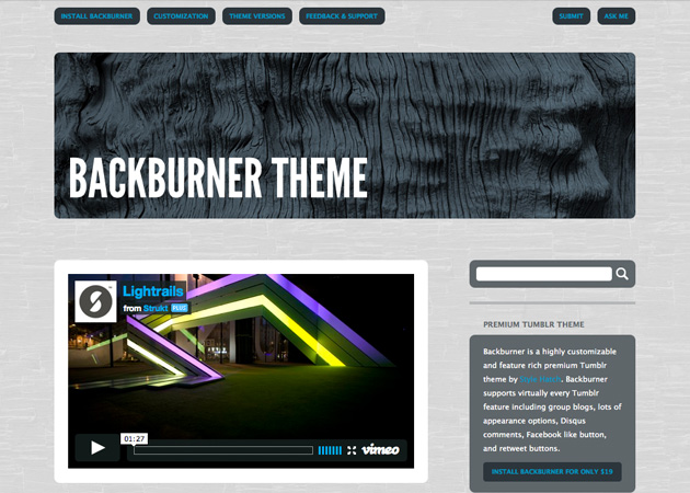 Backburner is a highly customizable and feature rich premium Tumblr theme by Style Hatch. Backburner supports virtually every Tumblr feature including group blogs, lots of appearance options, Disqus comments, Facebook like button, and retweet buttons.